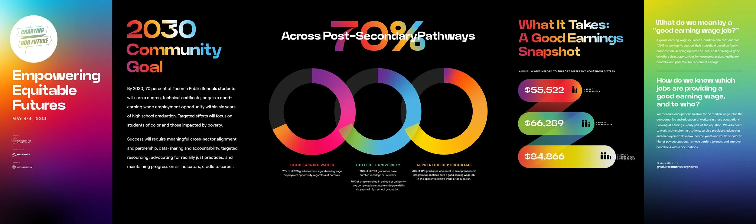Charting Our Future is an annual conference put together by the Foundation For Tacoma Students. It brings together education leaders, advocates, and allies to create meaningful change and work towards a brighter future. 2023's installment used the title and theme "Empowering Equitable Futures," and its organizers wanted to develop a look that would be more exciting and engaging than the typical non-profit conference. Using unexpectedly bold colors and typography, I set out to create a quasi-futuristic, hopeful tone that would invite attendees to imagine future possibilities beyond their current expectations.